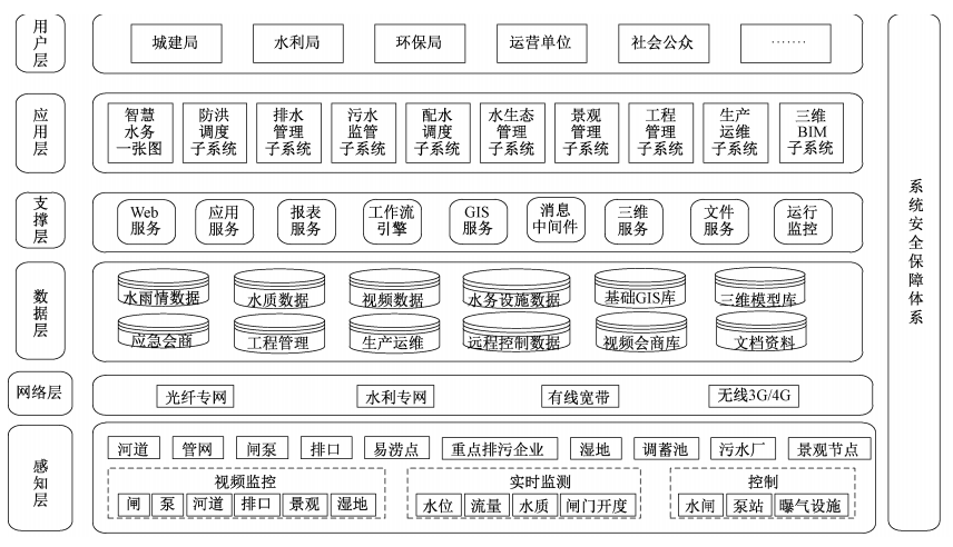 鹤山市河长制智慧一体化管控平台的智慧水务系统按照智慧水务顶层设计的思路,借鉴目前国际、国内同类项目建设经验,搭建适应的智慧水务功能框架,总体架构按6个层次设计,分别为感知层、网络层、数据层、支撑层、应用层和用户层,智慧水务总体技术架构见图1。