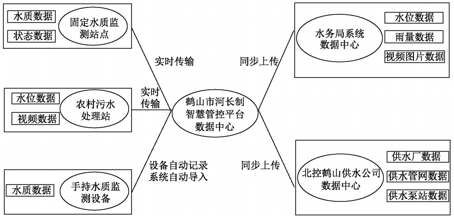 河长制工作涉及数据与信息众多,为保证信息和数据的同一化,进行全市全流域的协同调配。鹤山市建立河长制数据中心,将河长制管理相关的数据(包括相关制度、工程计划、污染源管理、河长牌管理、河长管理信息、供排水设施数据、水环境数据等)利用鹤山市河长制智慧一体化管控平台进行同一管理和维护,同时建立各相关部门之间的数据上报与信息共享机制,定期进行信息更新,并将部分信息对公众发布,以推动公众参与,同时为实现环保教育常态化提供支撑。数据库系统交互关系如图3所示。