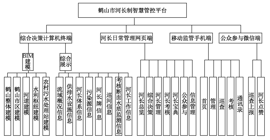 鹤山河长制智慧一体化管控系统分两期实施,一期主要为鹤山市河长管理工作提供平台和工具,实现主要数据的综合管理、河长巡查、公众参与、河长考核等功能,全方位管理和协调河长工作,保证河长工作的时效性和穿透力;二期在一期基础上,进行业务模块扩展,可以包括防洪排涝预测预报与风险管控、水资源在线监控与优化调度、水环境监测预警与控制联调、供排水一体化联合调度管理等。软件平台应用系统功能结构示意见图4。