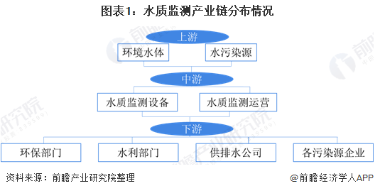 水质监测行业产业链上游包括各种水源,如我国地表水,包括各河流、湖泊水库、饮用水源地、城市景观河道、水利工程水,以及我国各污染行业排除的废水污水,这些是我国水质监测的对象。水质监测行业产业链中游包括水质监测设备和水质监测运营服务。水质监测行业产业链下游包括环保部门、水利部门、供排水公司、各污染源企业等。环保部门、水利部门通过水质监测收集到的信息制定各种政策规划,以改善我国环境治理和水资源的质量。因国家对工业污染的管制越来越严格,因此各排水公司、各污染源企业在其工业化生产后所排出的污水废水都需经过监测,避免某些指标超标。