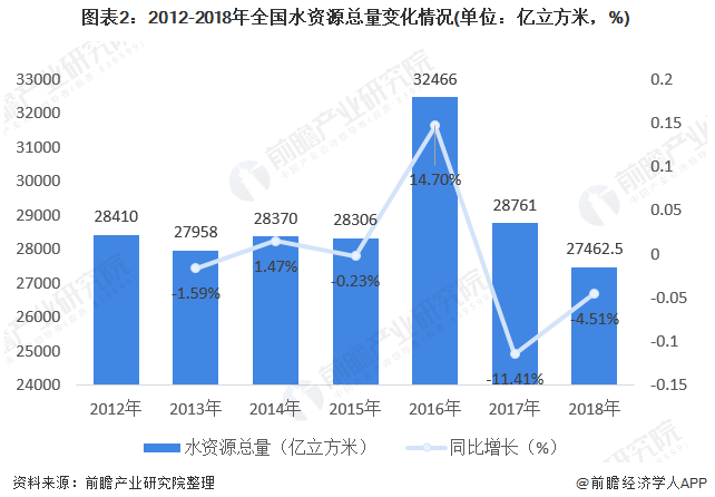 2019年7月13日,水利部发布了2018年度《中国水资源公报》,2018年水资源总量与多年平均值基本持平,全国用水总量比2017年略有减少,用水效率进一步提升,供用水结构不断优化。2018年,全国水资源总量27462.5亿m3,与多年平均值基本持平。其中,地表水资源量26323.2亿m3,地下水资源量8246.5亿m3,地下水与地表水资源不重复量为1139.3亿m3。