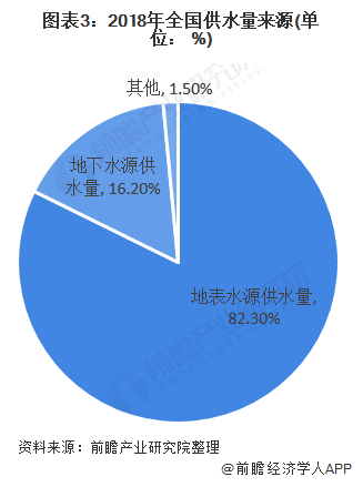 2018年地表水源供水量4952.7亿m3,占供水总量的82.3%;地下水源供水量976.4亿m3,占供水总量的16.2%;其他水源供水量86.4亿m3,占供水总量的1.5%。