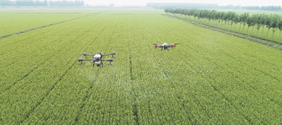 两台植保无人机在山东省临沂市郯城县马头镇大丰收家庭农场进行水稻病虫害飞防作业。房德华摄(人民图片)