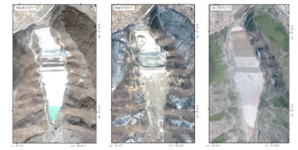 遥感监测发现,由于历史遗留或企业主体责任落实不到位等原因,一些尾矿库选址、设计不规范,尾矿库邻近重要河流、水源地等生态环境敏感目标,一旦发生事故极易造成严重污染影响。通过利用多时相高分辨率遥感影像,结合尾矿库周边敏感受体信息变化特征综合分析,可以辨识尾矿库环保治污设施安装情况,并分析尾矿库是否存在偷排废水行为,为尾矿库污染防控工作提供重要参考依据。