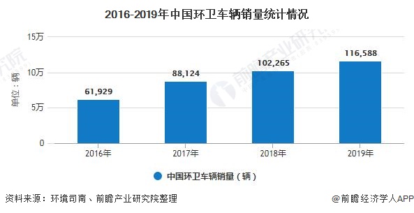 根据中国银行保险监督管理委员会的新车交强险统计数据,2019年全国环卫车辆销量116588辆,同比增长14.01%,近三年复合增长率为23.48%,同比增速有所减缓,环卫装备行业进入了稳步增长时期。