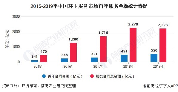 环卫服务市场化改革之初至目前成为必然的发展趋势,据环境司南不完全统计,2019年全国各地新签环卫服务合同总金额为2223亿元,同比略降2.41%,首年合同金额为550亿元,同比增长12.02%。