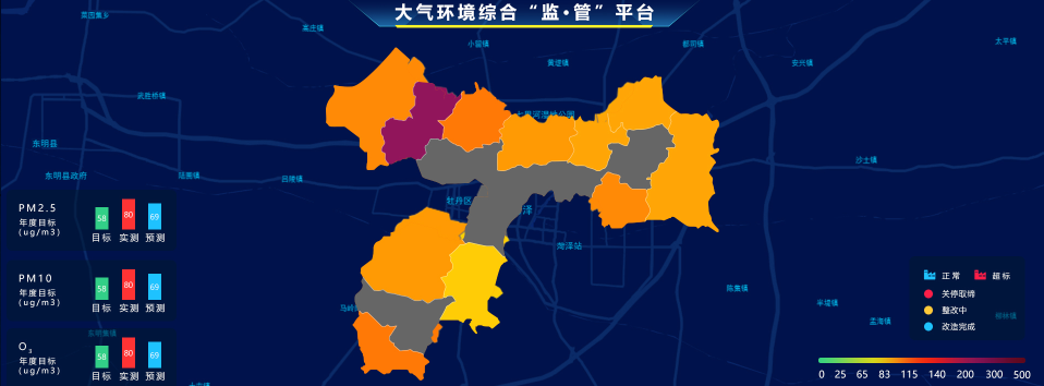 在菏泽市“四区”大气污染防治工作指挥部的正确指挥下,生态环境大脑自2019年正式运行以来,与督办问责组、专家团队及五大战区工作队伍密切配合,顺利完成2019-2020年冬防目标,助力菏泽圆满完成2019年空气质量年度目标,从“精确监测、精准预测、精密溯源、精妙控制”等方面综合提升菏泽生态环境监测现代化能力。