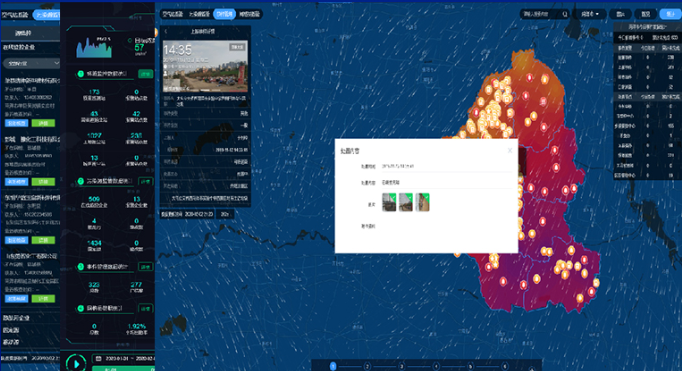 指挥中心集市、县、乡于一体,纵向串联11个区县级、172个乡镇级指挥中心,横向打通生态环境局、住建局、城管局等14个职能部门,形成数据集约管理。截止到目前,大数据中心已接入21个国省控空气、152个乡镇空气站、56个国省道扬尘监测站、30个地表水站点、1000余个建筑工地扬尘监测站、2000余个建筑工地视频、近4000家污染源企业、3000余家电监管平台企业、6套遥感监测点位以及其他7万余辆机动车、渣土车信息。