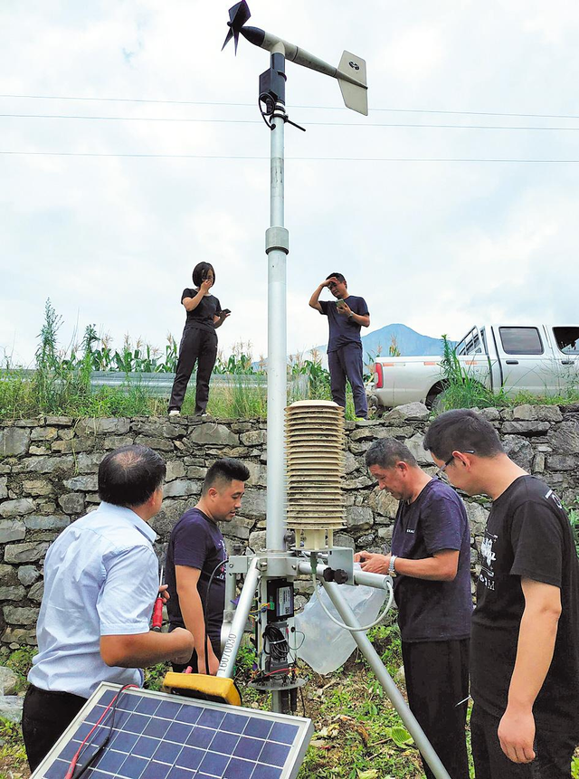 工作人员安装便携式灾害监测设备,实现精准监测,服务抢险救援