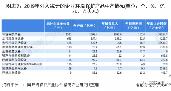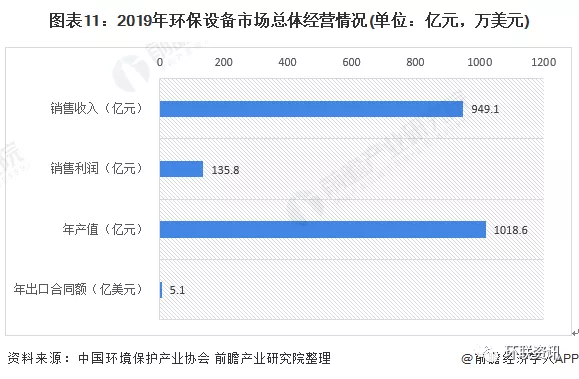 在《2020环保产业发展状况报告》中,2019年纳入统计的环保设备市场共有1583家企业;年产值为1018.60亿元,销售收入和销售利润分别为949.10亿元和135.80亿元,实现出口合同额51245.60万美元。