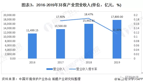 随着污染防治攻坚战的实施,我国环保产业市场需求进一步释放,环保产业发展的营商环境持续改善,环保产业规模继续保持较快增长,全行业工艺和技术装备水平稳步提升、创新模式深入推进,产业结构不断完善,行业格局逐步优化。尽管受到2018年产业发展流动性危机余波及中美贸易摩擦的影响,2019年一些环保企业依然面临着经营危机,但总体来看,2019年环保产业整体发展态势趋好,持续保持了较快发展。据中国环境保护产业协会测算数据,2019年全国环保产业营业收入约17800亿元,较2018年增长约11.3%。