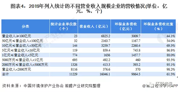 我国环境保护产业协会统计企业共有11229家,其中共有大型企业385家、中型企业2728家、小型企业3957家、微型企业4159家。其中,大、中型企业数量占比分别为3.4%、24.3%;小、微型企业数量占比为72.2%,可见,我国环保企业仍以小微型企业为主。大型企业数量少,产出贡献大,80%以上的产业营业收入集中于占比约10%的营业收入过亿的企业。92.0%的营业收入、87.6%的环保业务营业收入集中在年营业收入1亿元以上的企业,该部分企业的单位数量占比仅为9.8%,营业收入在2000万元以下的企业单位数量占比高达72.3%,其营业收入占比仅为2.3%、环保业务营业收入占比3.8%。营业收入规模越小的企业,环保业务营业收入在总营业收入中所占比重越高,其环保专业化程度也越高,营业收入超过l00亿元的企业,环保业务营业收入平均占比为44.l%,营业收入小于2000万元的企业,其环保业务营业收入平均占比达98.2%。