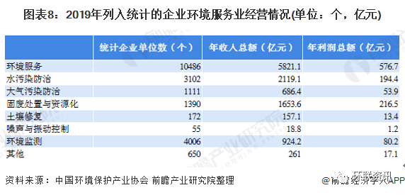 据环境保护产业协会数据,2019年我国列入统计的环境服务企业共10486个,年收入总额为5281.1亿元,年利润总额为576.7亿元。