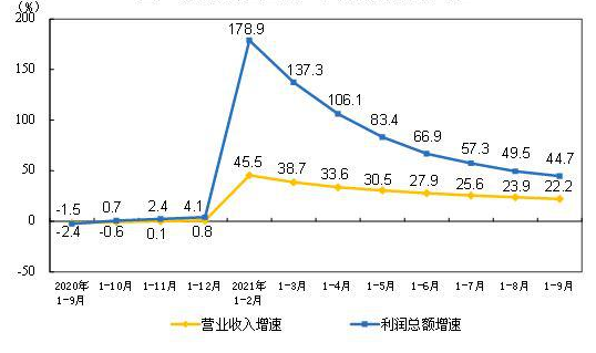 1-9月份,规模以上工业企业实现营业收入91.16万亿元,同比增长22.2%;发生营业成本76.33万亿元,增长21.3%;营业收入利润率为6.96%,同比提高1.09个百分点。