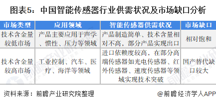 从我国智能传感器产品结构来看,应用于工业控制、汽车、医疗、海洋等领域的智能传感器进口依赖度较高,此类智能传感器市场缺口较大;应用于声学、惯性、压力等领域的智能传感器产品取得一定研发成果,市场相对饱和。