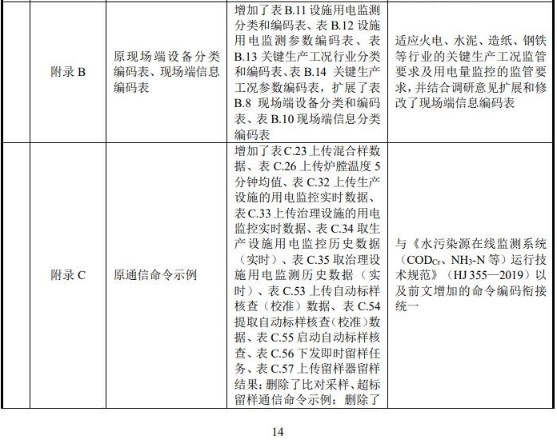 7)附录 B 扩展了表 B.8 现场端设备分类和编码表、表 B.10 现场端信息编码表;扩展了表 B.11 设施用电监测分类和编码表、表 B.12 设施用电监测参数编码表、表 B.13 关键生产工况行业分类和编码表、表 B.14 关键生产工况参数编码表;